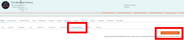 - Navigate to the Payment Plan Options tab, located under Settings for any program, season, or club card